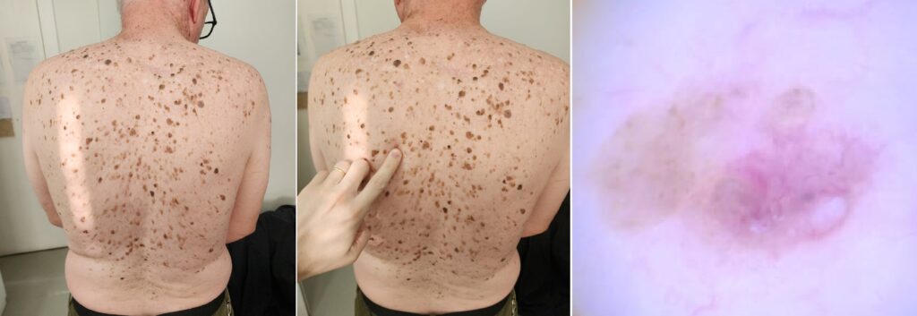- Hiperplasias Sebáceas: Identifica glândulas de gordura amareladas com vasos em formato de “coroa”.